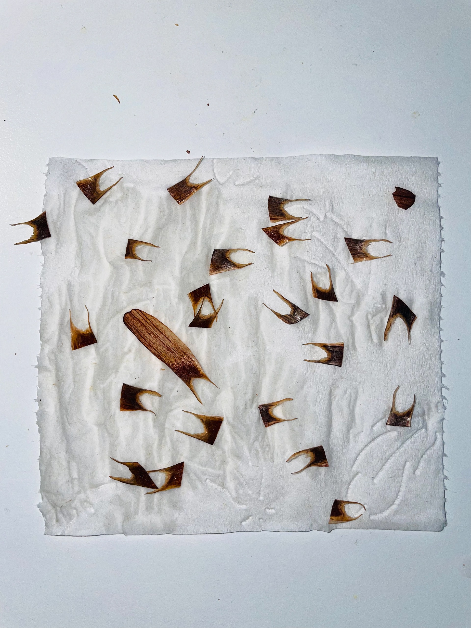 Cut pine seed wings on soft tissue